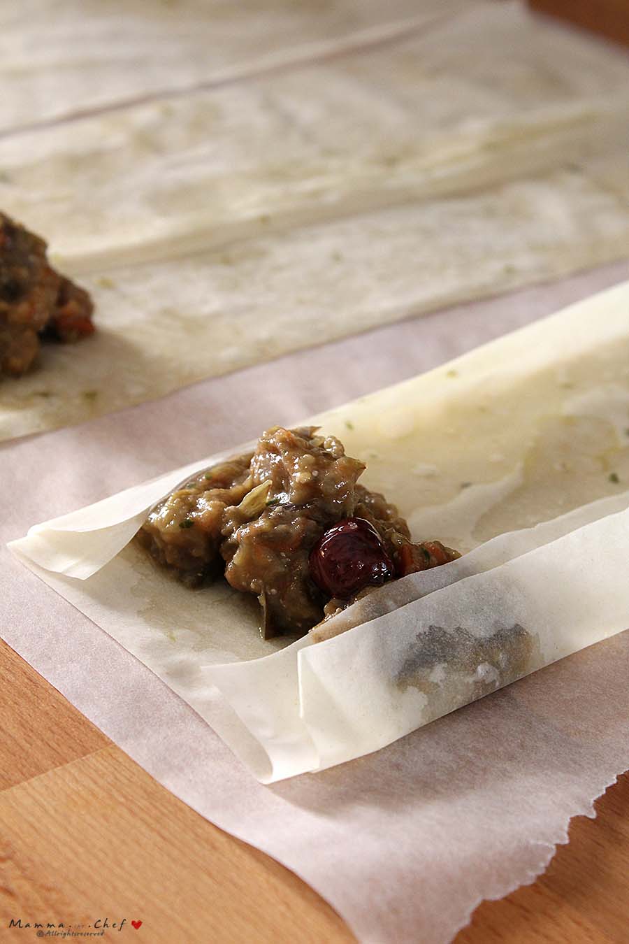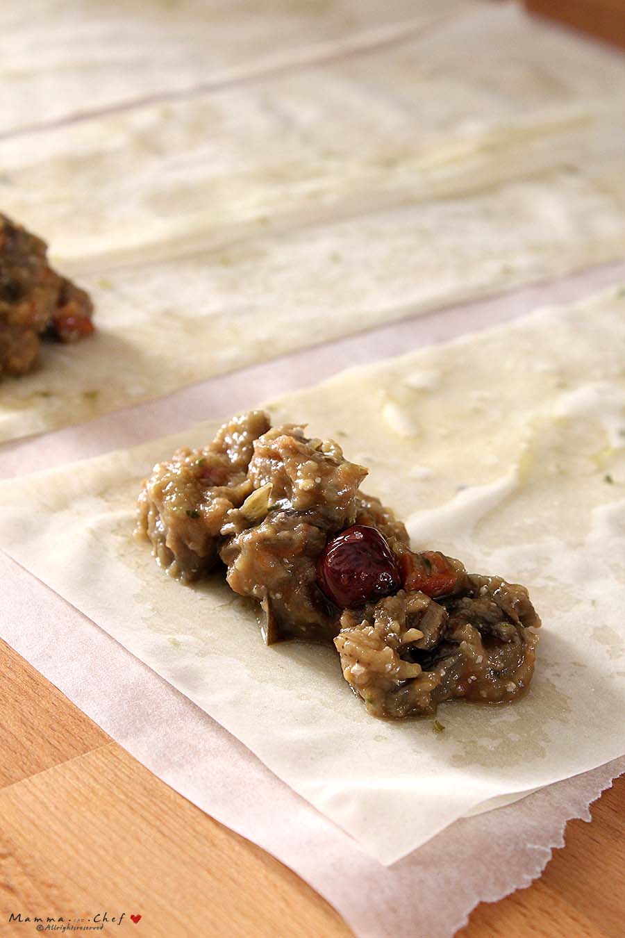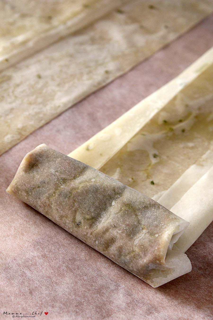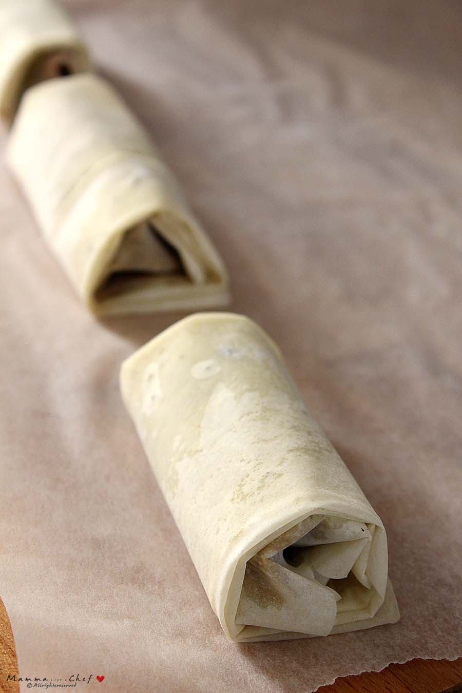 - Ripiegate i bordi laterali della pasta fillo e arrotolate bene cercando di evitare la fuoriuscita del ripieno.