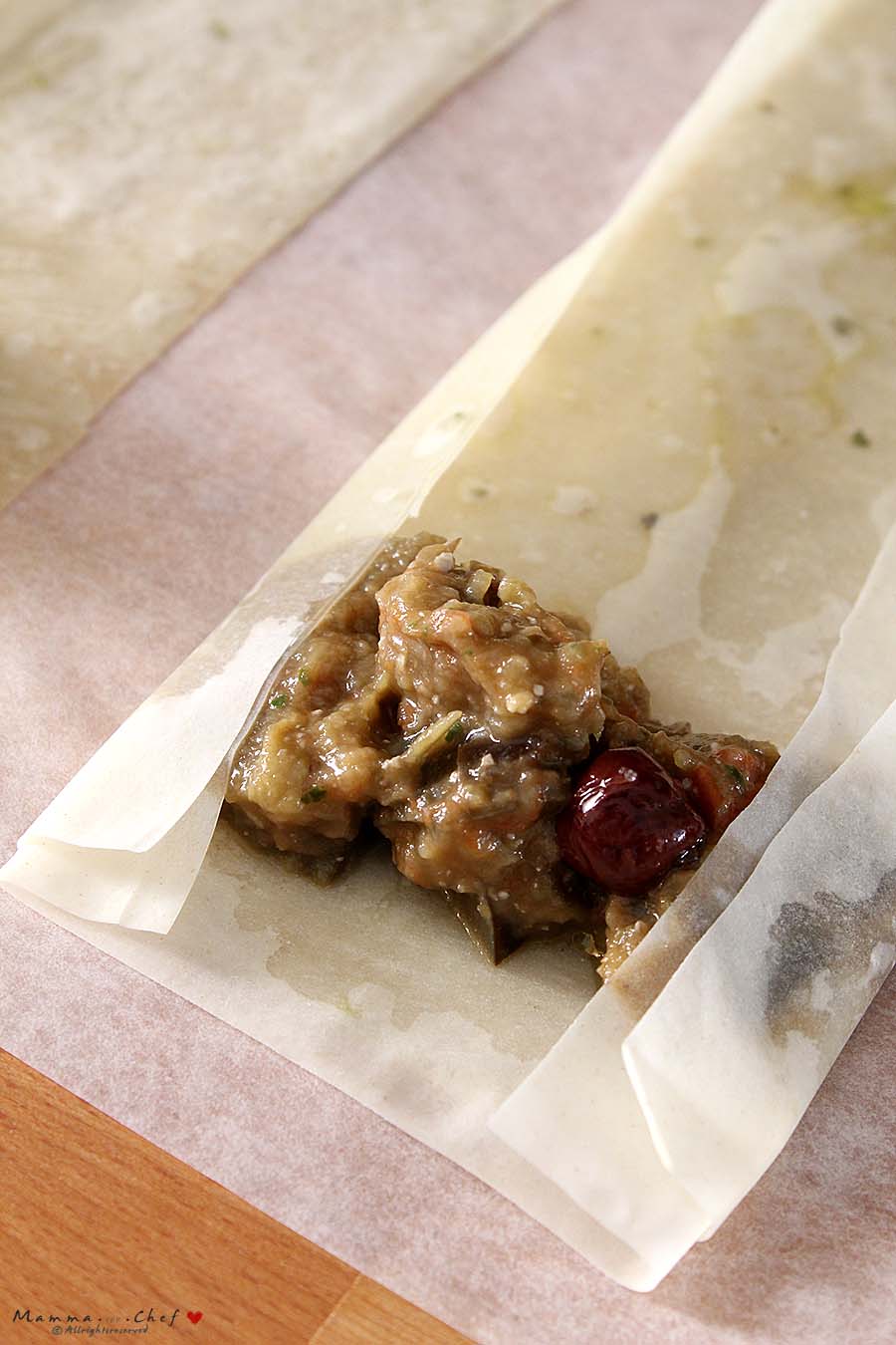 - Disponete gli involtini sopra una teglia con carta forno, spennellate con olio e infornate, forno ventilato e preriscaldato, a 200° per 10 minuti circa (controllate spesso, mi raccomando!).